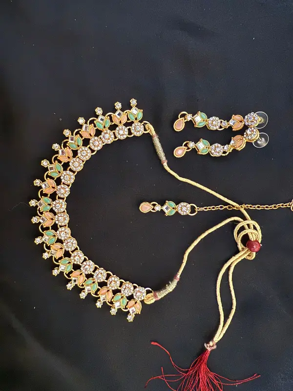 • Matching Earrings: The earrings match the necklace and tikka, completing the set.