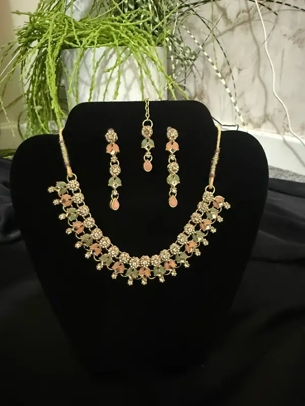 • This set includes a necklace and a tikka, paired with matching earrings.