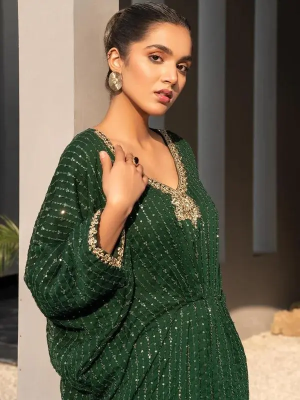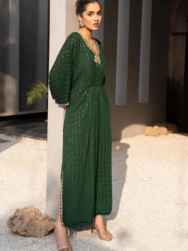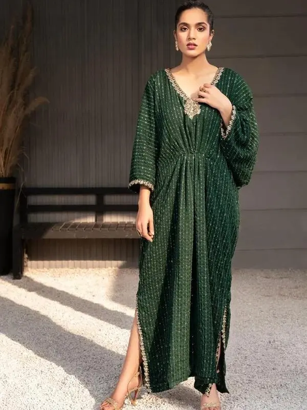 This kaftan features a neck design, adding sophistication to your outfit. The dark green color provides a versatile look, perfect for pairing with various accessories. The elegant design makes it suitable for both special occasions and casual wear. Made from chiffon, this kaftan offers a lightweight and comfortable feel. The embroidery adds a delicate touch, enhancing its appeal.