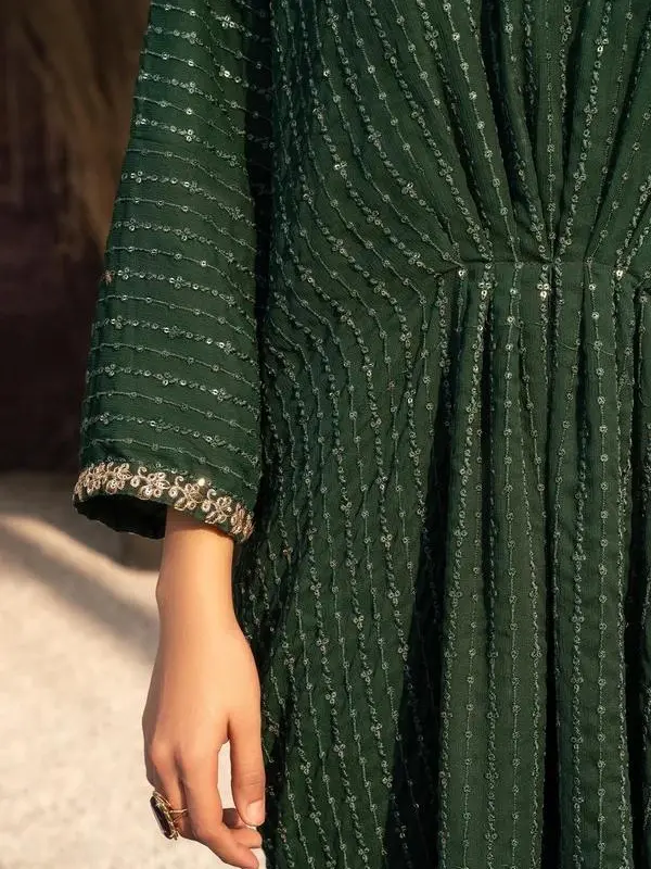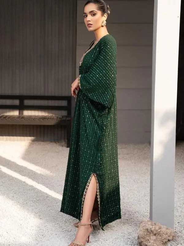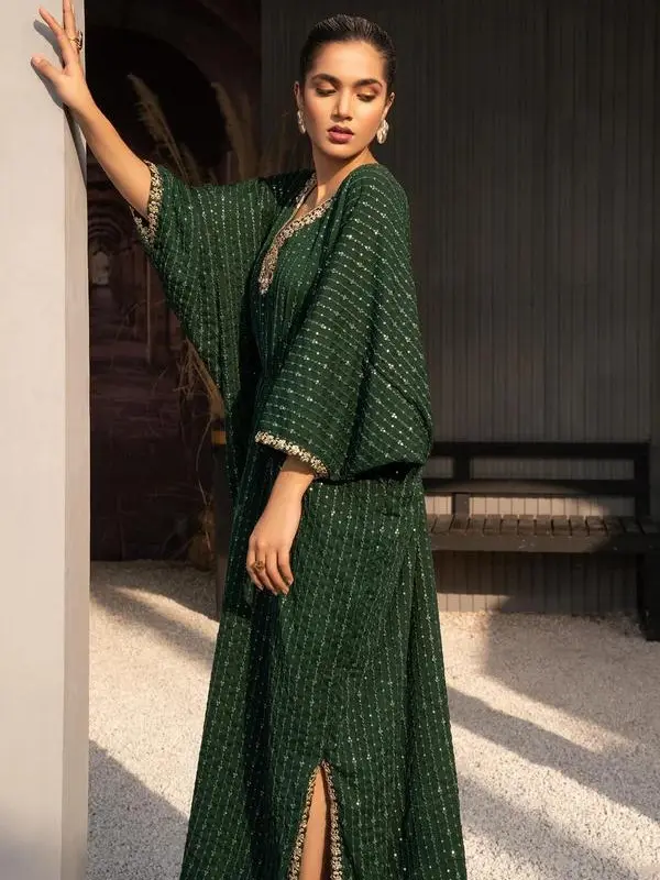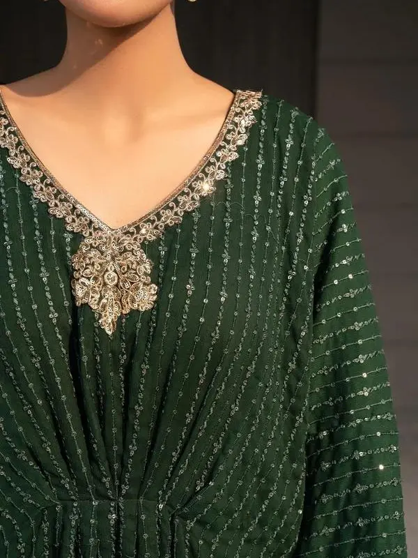 + Free Shipping🌿 Chiffon Embroidered Long Kaftan in Dark Green