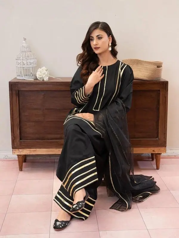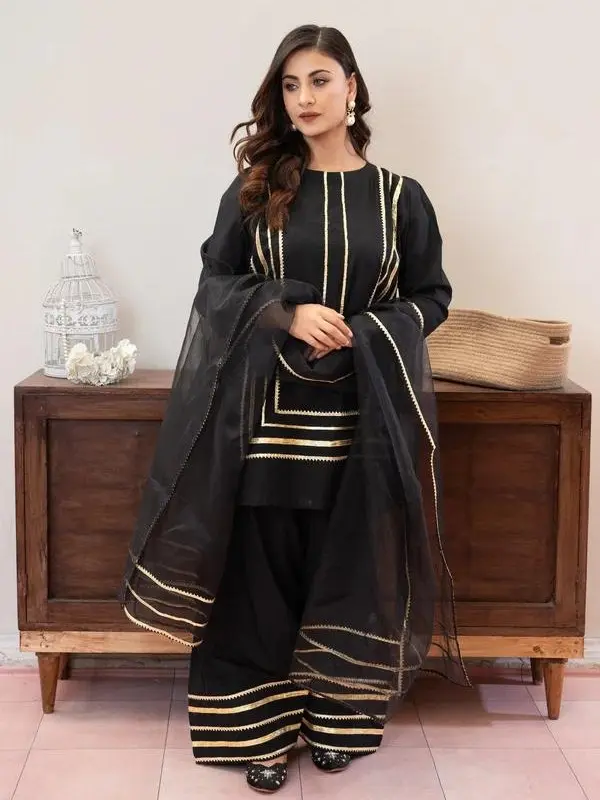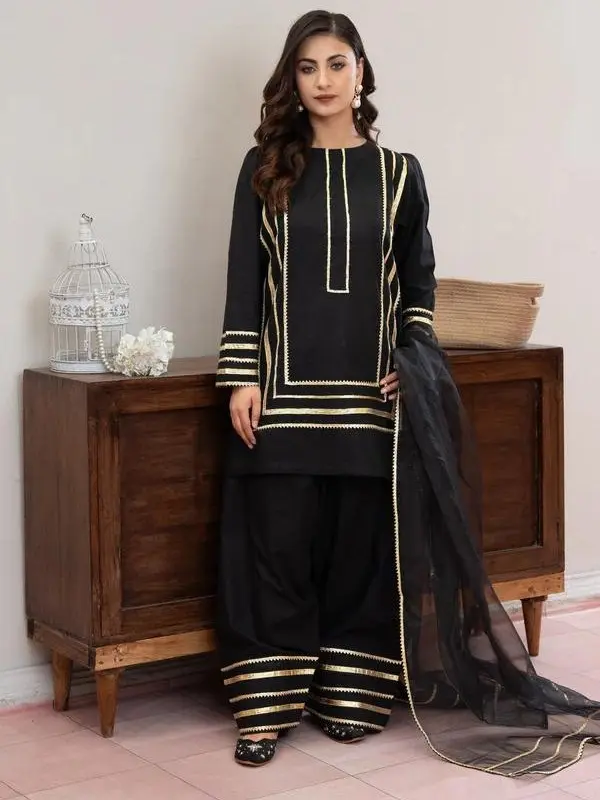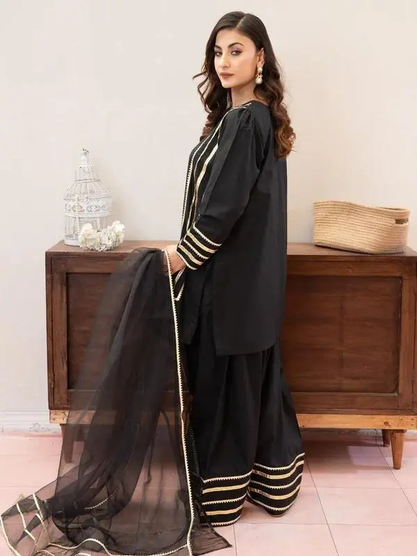 Cotton Tunic 3pc Set Kurta Lacework with Organza Dupatta Farshi Shalwar – Black Summer Wear Loose Fit Tunic Kurta