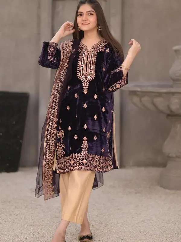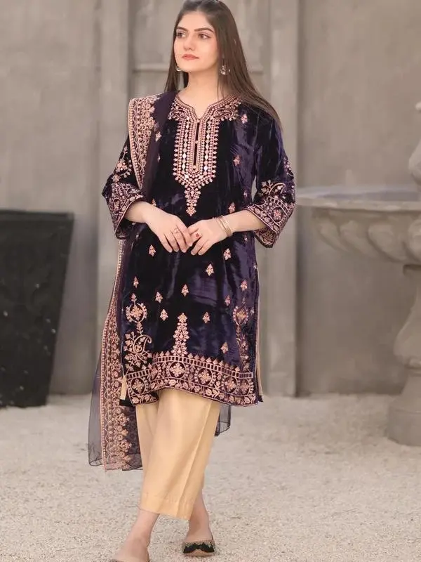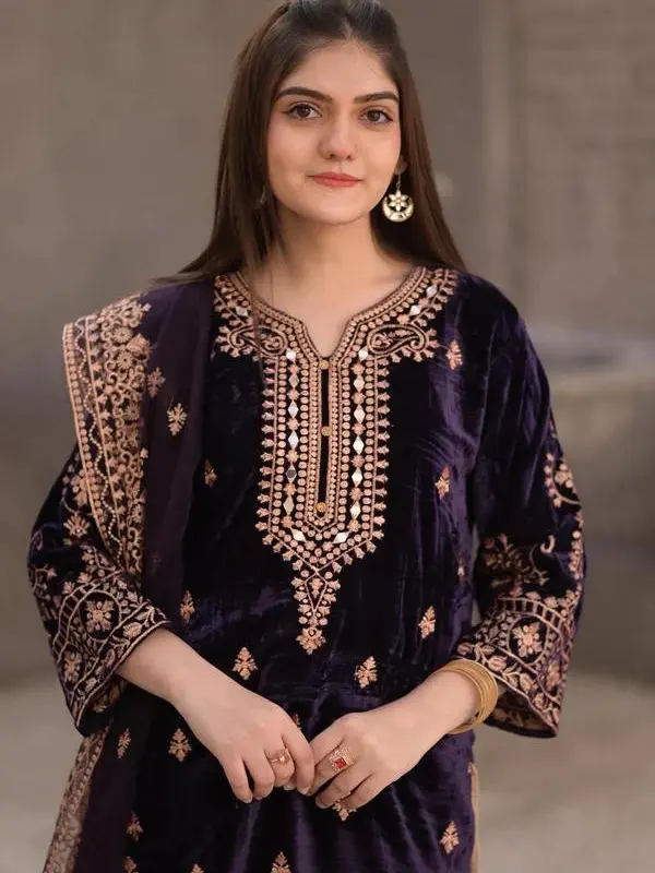 Elevate your winter wardrobe with the Velvet Winter Wear 3pc Suit. This ensemble features a straight cut kurta in plum purple, adorned with intricate embroidered details. The suit includes matching trousers, creating a coordinated look. Perfect for chilly days, this suit combines style and comfort.