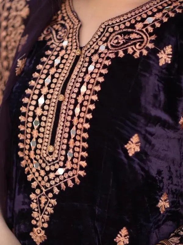 Velvet Winter Wear 3pc Suit with Straight Cut Kurta in Plum Purple Featuring Embroidered Details and Matching Trousers for Winter Casual & Semi-Formal Occasions